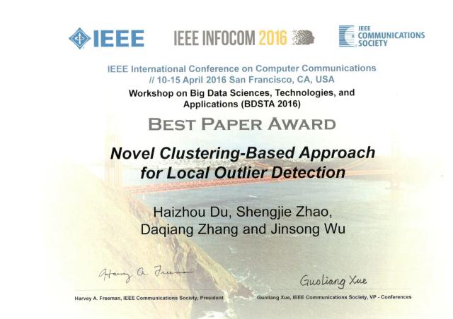 趙生捷教授的論文《基于聚類的新穎局部離群點檢測方法》 (Novel Clustering-based Approach for Local Outlier Detection)獲得了會議頒發的大數據科學、技術與應用workshop最佳論文獎(Best Paper Award for workshop on Big Data Sciences,Technologies,and Applications BDSTA 2016)。