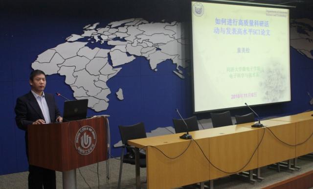 講座中,童美松教授首先回顧了科學技術發展的一般規律,強調創新是進行高質量科研活動和推動科學技術進步的關鍵和根本,并指出了進行創新性研究和提高學術水平的幾種途徑和方法,鼓勵教師要加入學術共同體、參加學術奧運會、提高科研水平的國際競爭力。緊接著,他詳細闡述了什么是SCI論文及其發展歷史、為什么要發表SCI論文以及如何發表高水平SCI論文等廣大教研室主任和其他教師非常關心的問題,強調高水平SCI論文來自于高質量科研活動產生的高質量科研成果,并通過大量例子就如何開展高質量科研活動和撰寫高水平SCI論文分享了自己的經驗和體會。