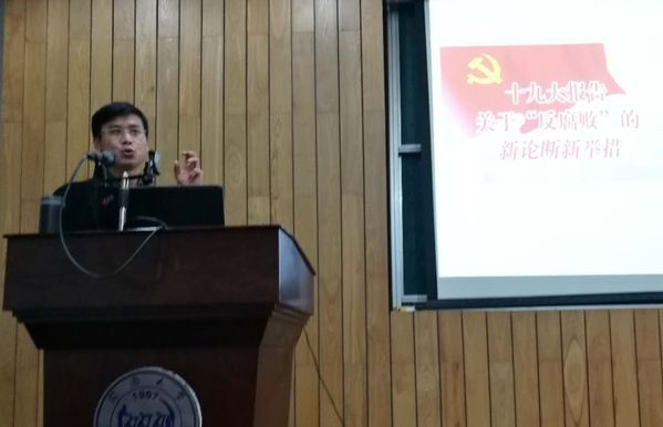 接著,吳利瑞同志圍繞黨章和紀檢監察工作,談了學習體會,指出全面從嚴治黨成為十八屆黨中央工作的最大亮點,贏得了廣大黨員干部和人民群眾竭誠擁護,堅持黨的領導的政治共識越來越強,走中國特色社會主義道路的信心決心更加堅定。通過生動的案例、詳實的數據,介紹了十八大以來我國反腐敗斗爭取得的重要成績,分析了反腐敗工作當前的形勢和紀檢監察工作的主要任務。報告結合同濟大學的實際情況,著重介紹了“從嚴管理校級領導,從嚴管理處級干部,從嚴管理全體教師,從嚴管理全體學生,推進學校治理體系和治理能力現代化”的全面從嚴治校思路。