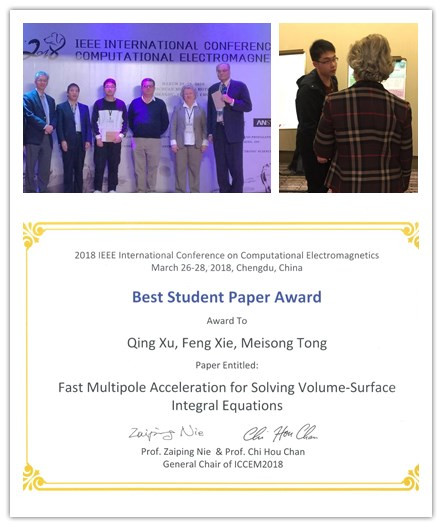 電子科學與技術系2017級碩士研究生徐卿受邀參加在成都舉辦的國際著名學術會議“2018 IEEE International Conference on Computational Electromagnetics (2018年IEEE計算電磁學國際會議)”,他在專門設置的“Competition for the Best Papers of Students(學生最佳論文競賽)”分會場作了題為“Fast Multipole Acceleration for Solving Volume-Surface Integral Equations(求解體–面積分方程的快速多極子加速方法)”的海報展示,受到競賽評委和觀眾的好評,事后被多位國際著名教授譽為“interesting work”及“excellent job”。