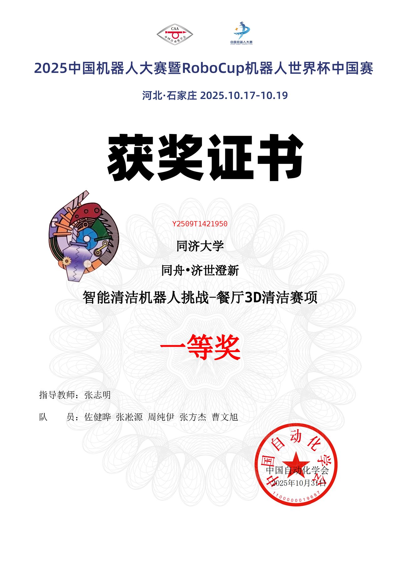 的優秀學子。團隊在控制系張志明、工程實踐中心楊曉圓及控制系朱勁老師指導下,由張旭磊(自動化)輔助管理,在四個賽項中均取得突破:同舟?濟世澄新隊斬獲智能清潔機器人挑戰-餐廳3D清潔賽項全國一等獎,隊長為佐健曄(自動化),隊員包括張凇源(自動化)、周純伊(中德工程六合彩結果