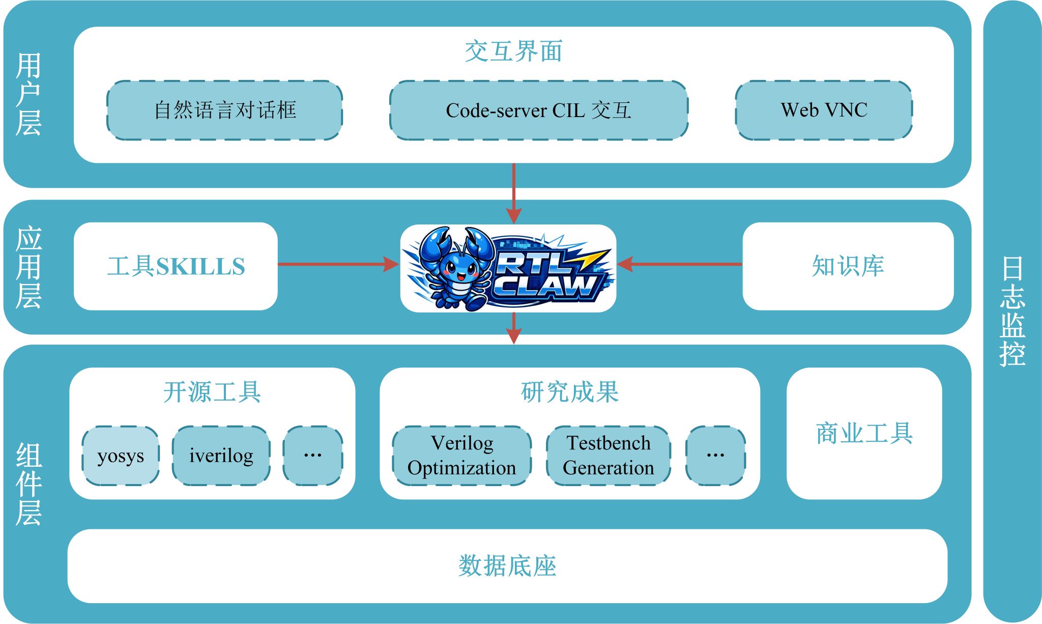 首先,RTL-CLAW的核心是AI智能體驅動的自動化工作流。 它基于OpenClaw框架構建。OpenClaw可以理解為一個面向復雜任務的智能體“操作系統”,而RTL-CLAW則是在這個系統之上,專門為芯片設計領域“培訓”的專業智能體。設計者不再需要記憶繁雜的命令和腳本,只需用自然語言或簡單的指令描述設計意圖(例如“優化這個Verilog模塊的時序”或“為這個接口生成測試環境”),AI智能體就會自動進行任務規劃,調用相應的分析、優化、驗證工具,并最終返回結果。